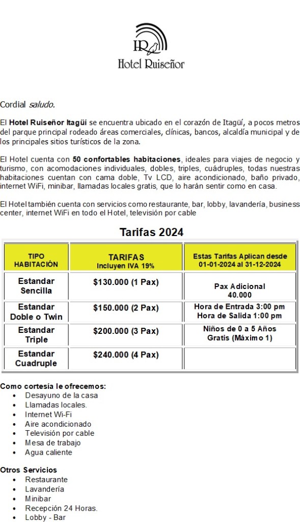 Este es el formato de Tarifas que se le envía a las empresas, agencias de viajes o clientes