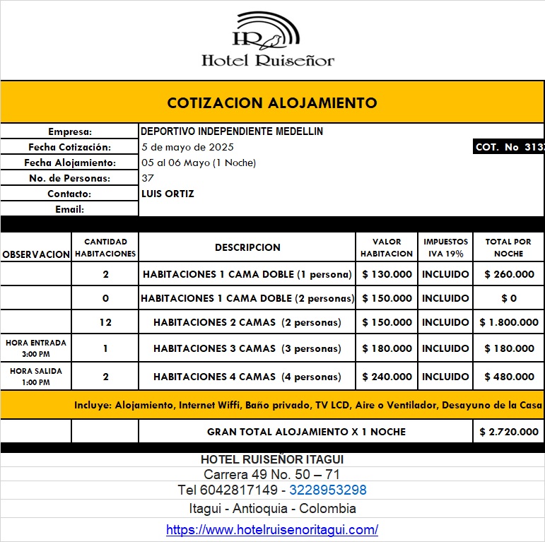De acuerdo a su gentil solicitud adjunto le envío la Cotizacion Alojamiento de acuerdo a sus requerimientos